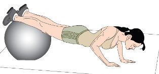 In this article you will find three cool variations of Push Ups Exercise Muscles Used in Push Ups with Exercise Balls - The Prime Movers: Pectoralis major and minor with help from deltoid and triceps muscles. Stabilizers: Abdominals and thigh muscles? Stabilizers help you to stabilize your torso in this tough position and these muscles are continuously firing. 1. Swiss Ball Push Ups Exercise a. With Feet on Swiss Ball This exercise is done similar to regular push ups but with your feet on the Swiss ball. Step 1: You begin the exercise with your arms extended and feet on the Swiss ball as shown in the picture. Keep your body, abdominals and arms tight and nice. Take a deep breath in. Step 2: From this position, lower yourself keeping your body tight and rigid just like in regular push ups. You will find the Swiss ball variation more difficult because the ball is an unstable surface and will force your core muscles to be highly activated. There is where the benefit lies in this exercise. b. With Hands on the Swiss Ball